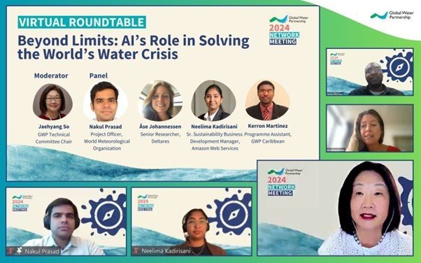 A major highlight of the meeting was the Roundtable discussion titled Beyond Limits: AI’s Role in Solving the World’s Water Crisis, led by Jaehyang So, Chair of GWP’s Technical Committee. The panel featured experts from diverse fields: Nakul Prasad (WMO), Neelima Kadirisani (Amazon Web Services), Åse Johannessen (Deltares), and Kerron Martinez (GWP Caribbean).