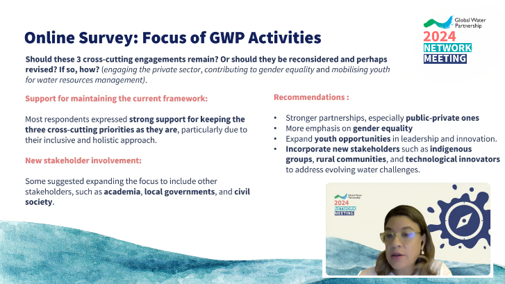 During the Network Meeting, Fabiola Tabora, Regional Coordinator for GWP Central America, shared findings from the 126 analysed survey responses. The results highlighted strong support for retaining GWP’s anchor areas while recommending some adjustments. Suggestions included emphasising approaches that complement Integrated Water Resources Management (IWRM), such as Nature-Based Solutions, the Water-Energy-Food-Ecosystems Nexus, and local water cycle restoration. There was also a call for stronger piloting efforts and openness to emerging areas. Respondents urged GWP to deepen partnerships, especially with indigenous groups, rural communities, academia, local governments, and other stakeholders.